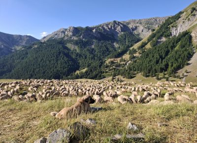 Le troupeau est composé de 1200 brebis (Mourérous et Préalpes du Sud habituées à la garde) à surveiller sur un seul alpage durant toute la période de l’estive. Les animaux sont rassemblés en parc de nuit tous les soirs et accompagnés de chiens de protections habitués aux promeneurs.